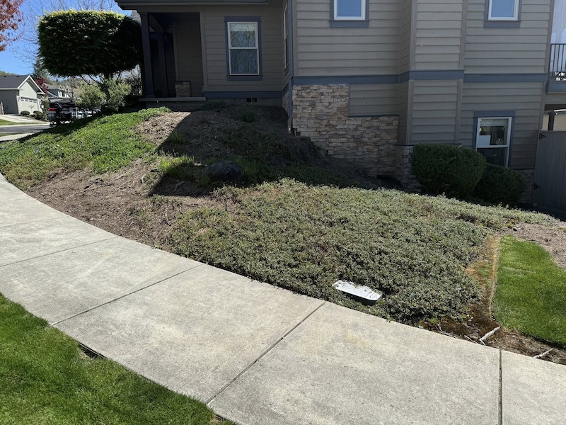 The completed front yard showcases a tiered natural stone retaining wall that stabilizes the slope while adding architectural interest. Paired with a dry creek bed that manages runoff and enhances aesthetics, and lush sod supported by irrigation, the transformation is striking. The before image of the side yard, with its overgrown mess, contrasts sharply with the polished result. Real estate experts agree that curb appeal is a key factor in home sales. According to the National Association of Realtors, homes with well-maintained landscapes can sell for 5-11% more than similar homes without. This Medford project turns a liability into an asset, making a lasting first impression on potential buyers.